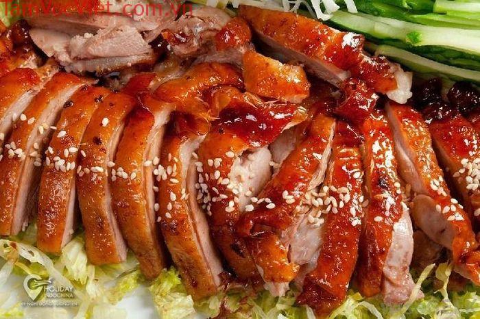 - Vịt quay 7 vị – Là một đặc sản nổi tiếng của Cao Bằng, mang đậm hương vị núi rừng và văn hóa ẩm thực đặc sắc của vùng đất này. Được chế biến từ những nguyên liệu đặc biệt, món ăn không chỉ hấp dẫn bởi hương thơm độc đáo mà còn bởi sự tinh tế trong từng công đoạn chế biến. Đặc biệt, việc sử dụng các loại lá và gia vị rừng như gừng, tỏi, hành khô, quả mắc mật và mật ong, tạo nên sự hòa quyện hoàn hảo giữa mùi vị đậm đà, ngọt nhẹ và cay nhẹ, làm say đắm lòng thực khách.