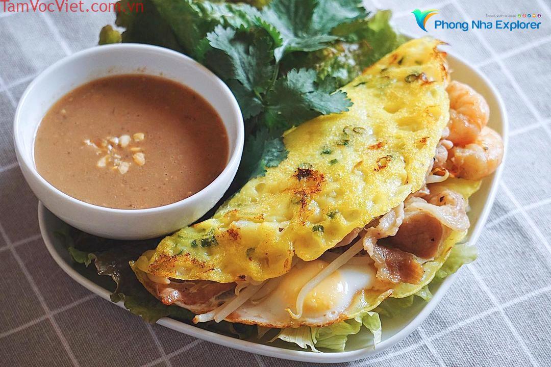 Bánh khoái là món không thể bỏ qua khi tới Quảng Bình. Bánh giống bánh xèo, nhưng dày hơn, nhân thịt bò, tôm tươi. Thực khách sẽ dùng bánh tráng cuốn miếng bánh khoái, kèm rau chấm vào nước mắm chua ngọt.