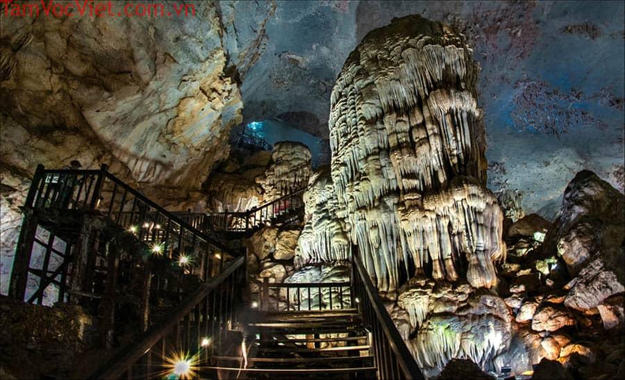 Du khách sẽ phải leo hơn 500 bậc để lên đến động. Bước qua cửa động là một không gian rộng lớn, vô vàn thạch nhũ, măng đá. Với chiều dài 31,4 km, động Thiên Đường được coi là hang động khô có chiều dài kỷ lục ở châu Á.