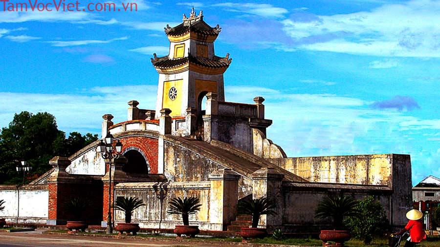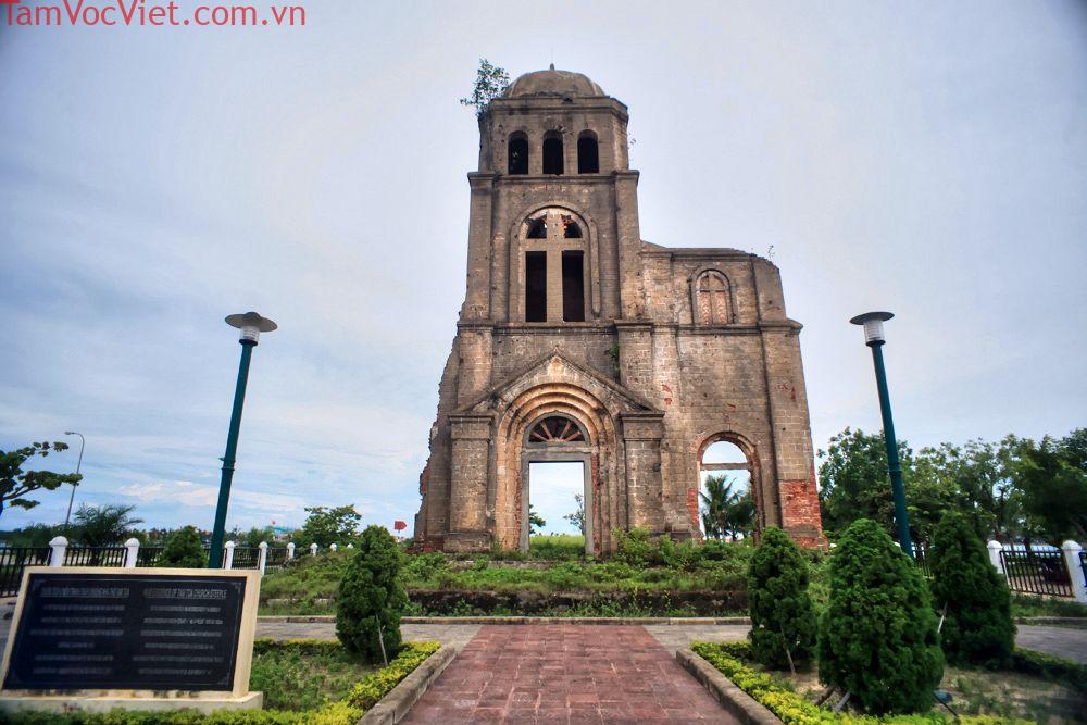 Nhà thờ Tam Tòa nằm ở trung tâm TP Đồng Hới, bên dòng sông Nhật Lệ. Nhà thờ có chiều cao khoảng 10 m. Trải qua nhiều đợt tấn công bằng bom đạn trong chiến tranh, nhà thờ hiện chỉ còn lại phần tháp chuông ở mặt trước và một cột trụ bằng gạch trên nền móng bằng đá ở phía sau, nhưng vẫn giữ được nét đẹp cổ kính. Nơi đây là một trong những Di sản văn hóa lịch sử cấp tỉnh.