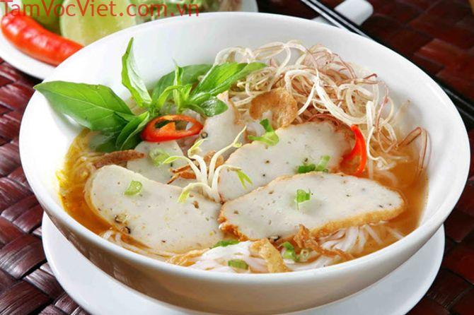 Chả cá làm từ cá biển tươi, dai và thơm tự nhiên. Nước dùng trong, ngọt thanh, không quá béo. Món ăn quen thuộc cho bữa sáng của người dân địa phương.