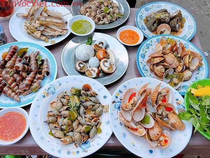 Hải sản tươi sống như cua, ghẹ, mực, tôm được chế biến đơn giản. Giữ trọn vị ngọt tự nhiên của biển. Du khách có thể thưởng thức tại các làng chài ven biển.