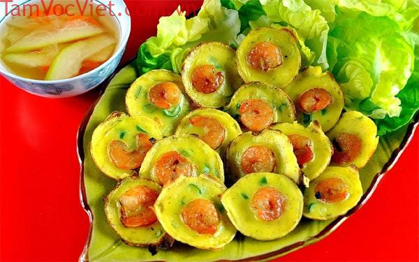 Nhắc đến Vũng Tàu, khó có thể bỏ qua bánh khọt – món ăn mang đậm dấu ấn địa phương. Bánh được làm từ bột gạo pha cùng nước cốt dừa, đổ vào khuôn nóng tạo nên lớp vỏ giòn tan. Nhân bánh phong phú như tôm, mực hay thịt băm. Khi thưởng thức, bạn sẽ cảm nhận được vị giòn bên ngoài, béo mềm bên trong, hòa quyện với hương thơm của hành phi và nước mắm chua ngọt. Ăn kèm rau sống, xà lách, cải bẹ và đu đủ bào sợi giúp cân bằng vị béo một cách tinh tế.